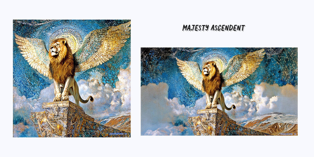 Commanding the heavens with a gaze of timeless strength, Majesty Ascendant captures the awe-inspiring power of true greatness. This winged lion, guardian of ancient realms and celestial truths, stands poised above a throne of intricate gold and stone—an eternal emblem of sovereignty and spirit.