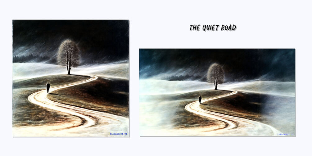 In the stillness of solitude, The Quiet Road invites you into a world where silence speaks louder than words. A solitary figure walks a winding path beneath a vast, brooding sky—each step a meditation, each shadow a companion. This evocative artwork captures the raw and honest beauty of being alone, not in despair, but in deep contemplation.