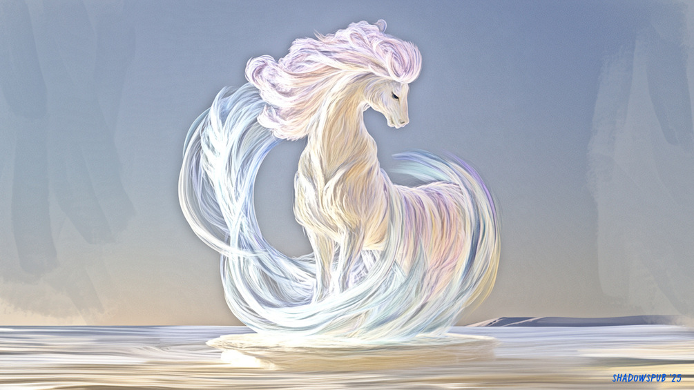 "The shimmering energy enveloping a majestic horse, standing proud with its mane flying, serves as a metaphor for the strength, self-awareness, and the journey toward our own freedom—it's within our power." -- ShadowsPub